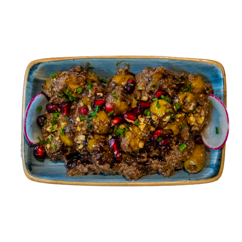 This special preparation features plump, green marinated olives, finely blended with tangy pomegranate molasses, crunchy crushed walnuts, garlic, and fragrant aromatic herbs (like mint). The result is a complex and irresistible mix of sweet, sour, savoury, and nutty notes – a true taste explosion unique to Iranian food.