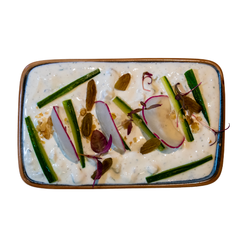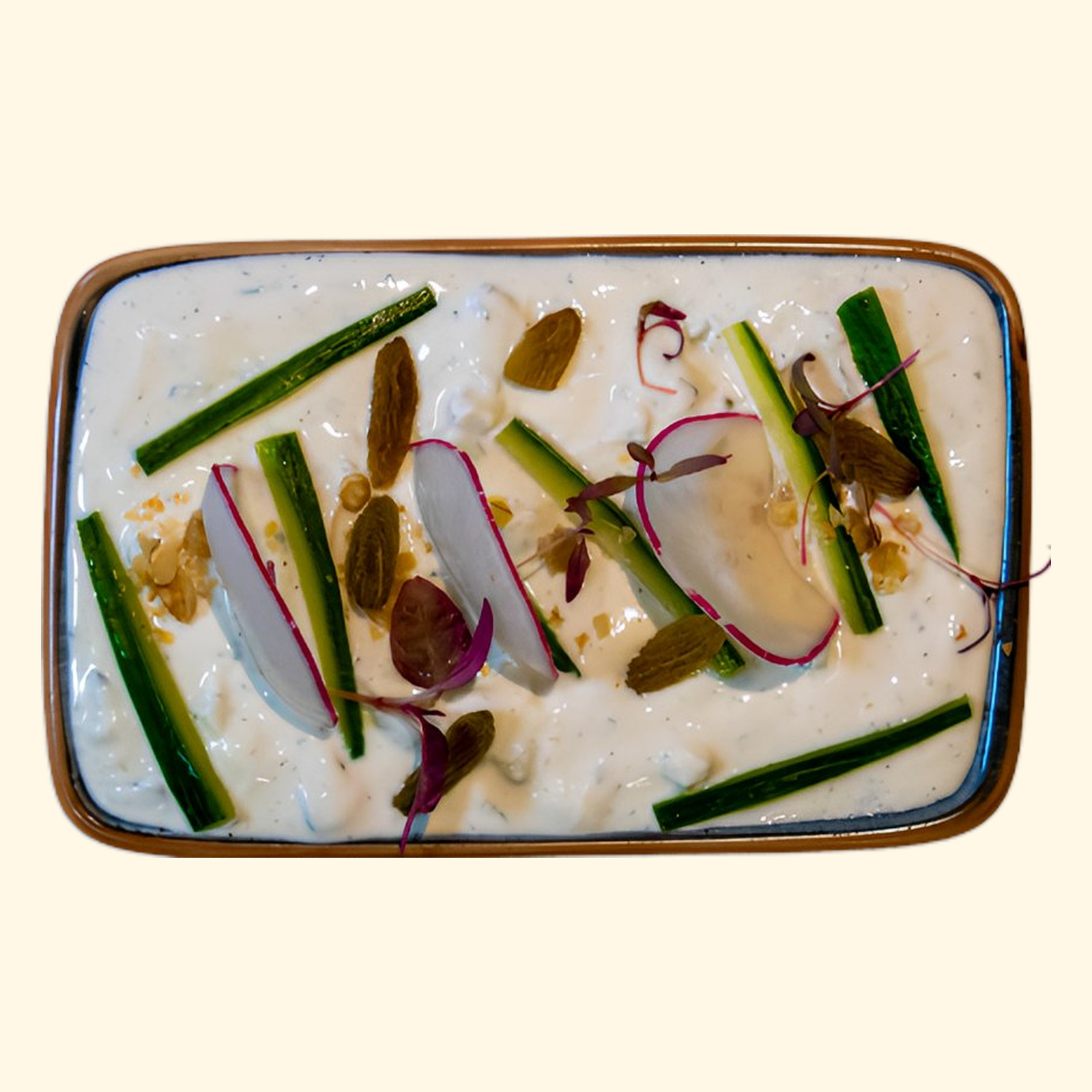 زبادي منزلي ممزوج مع الخيار، الزبيب، والأعشاب.